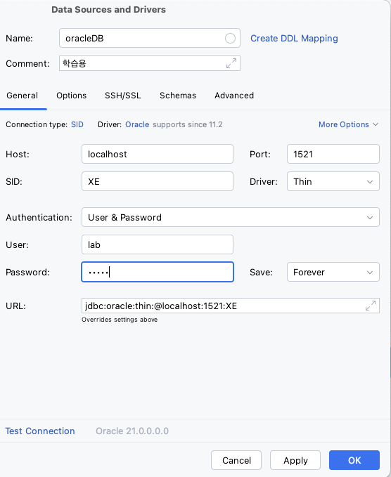 • 호스트 / 포트 : localhost:1521
